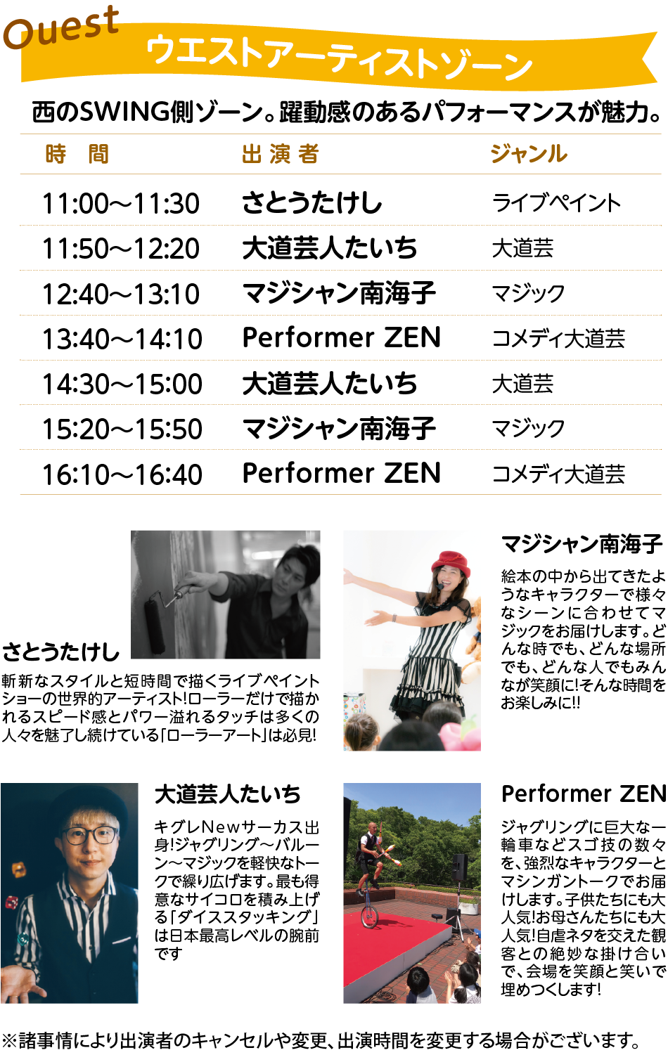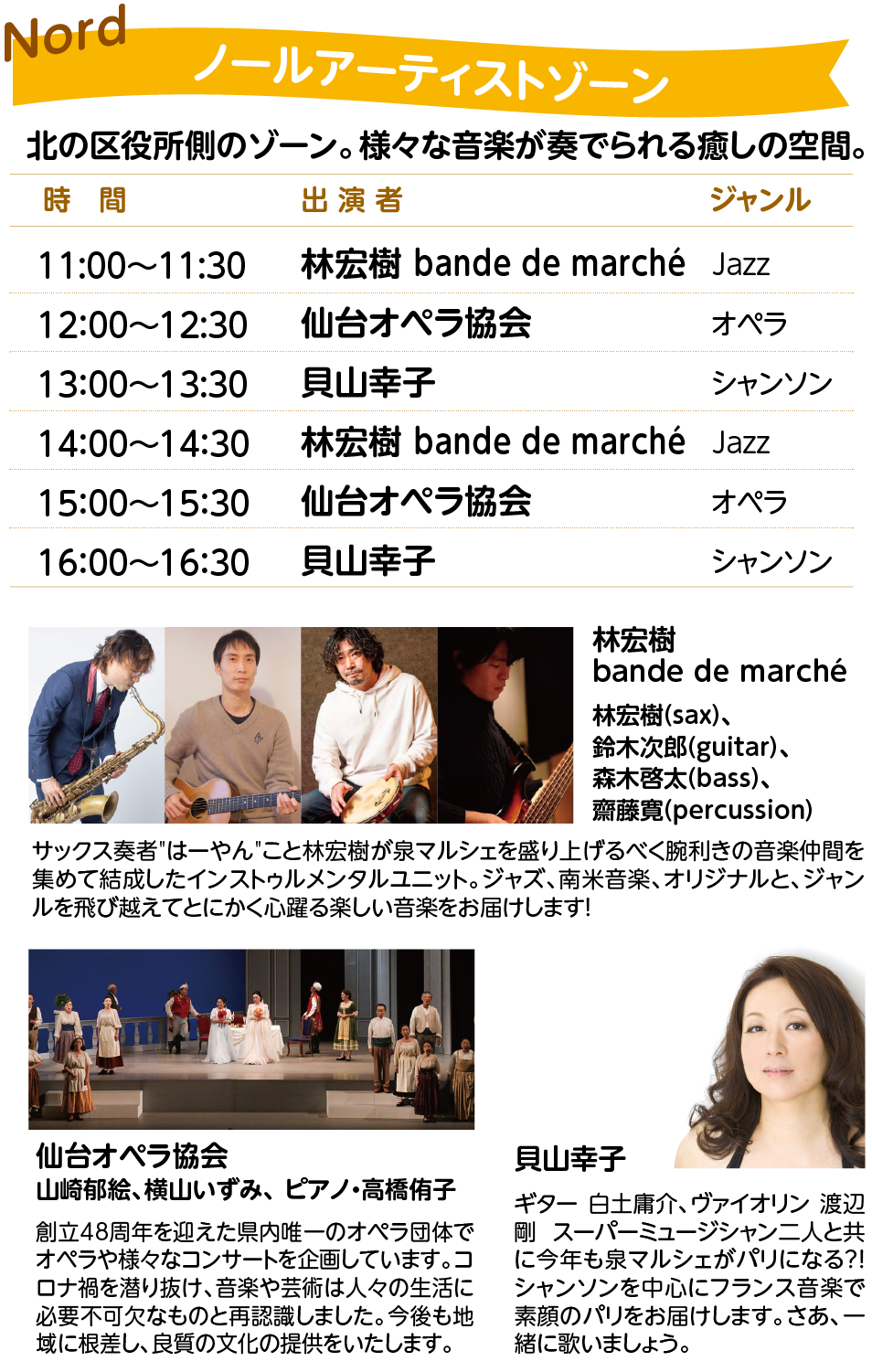 アンプラグト(生音)のライブやパフォーマーが入れ替わり泉マルシェを盛り上げます! 気に⼊ったライブ・パフォーマーには、是非投げ銭を!!
